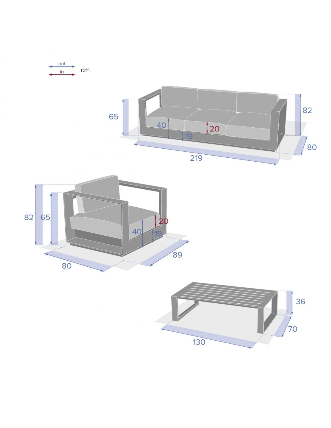 - L.219x P.80x H.65 cm