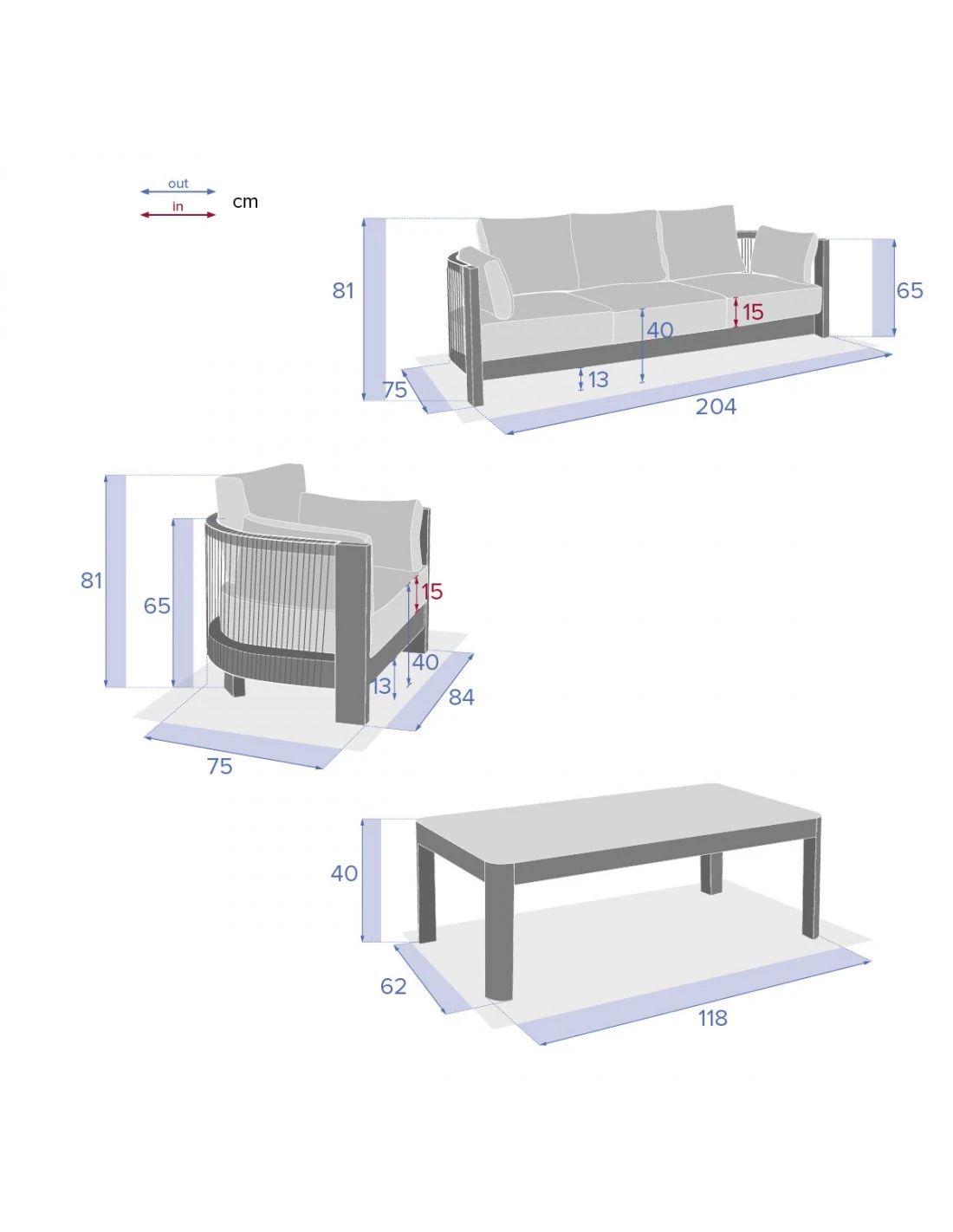 - L. 204 x P. 75 x H. 65 cm (34,9 kg)