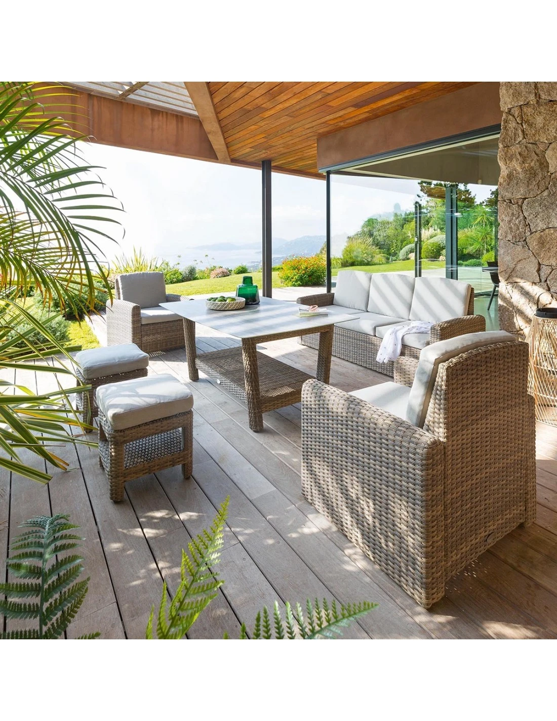 Salon 7 places, très confortable avec ses 2 fauteuils, 2 poufs, son canapé 3 places et sa table haute en plateau verre céramique.