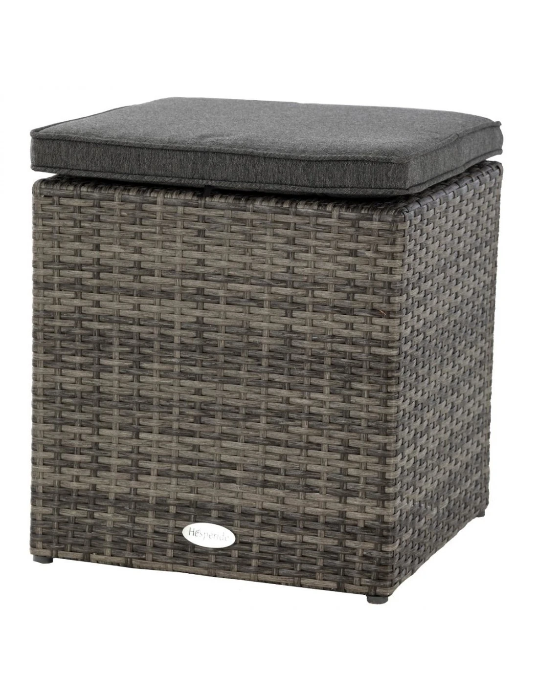 Salon de jardin en résine tressée, composé d’une banquette 3 places, 2 fauteuils, 2 poufs, une table haute, et des coussins épais !